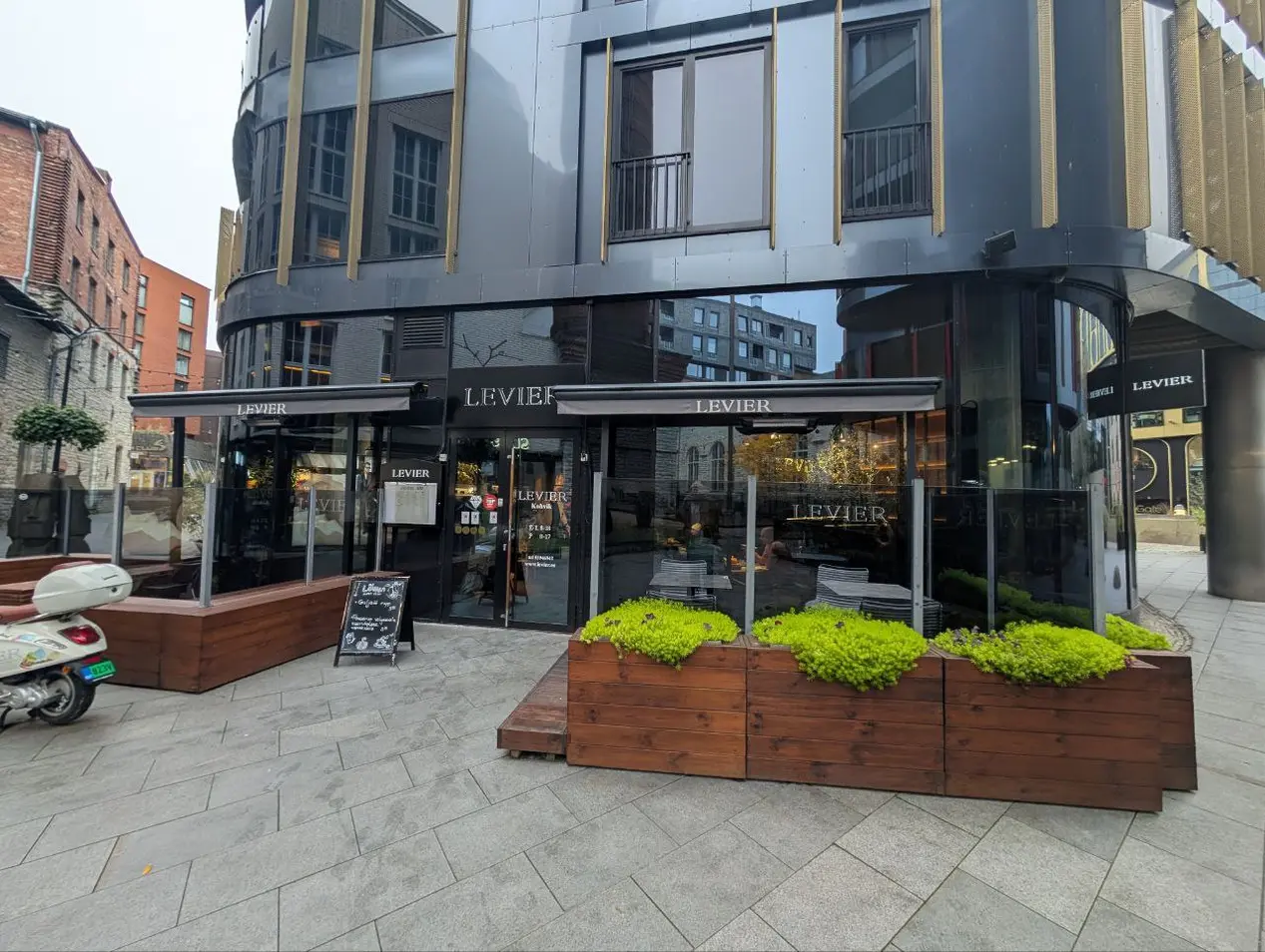 The stylish outdoor seating areas, framed by tall glass windbreaks and lush planters, create a pleasant haven for alfresco dining or a morning coffee. Inside, the atmosphere is bright and trendy, making Levier ideal for everything from business lunches to leisurely weekends with friends. With a creative menu and excellent coffee, it has quickly become a favorite spot among locals who appreciate both quality and style.