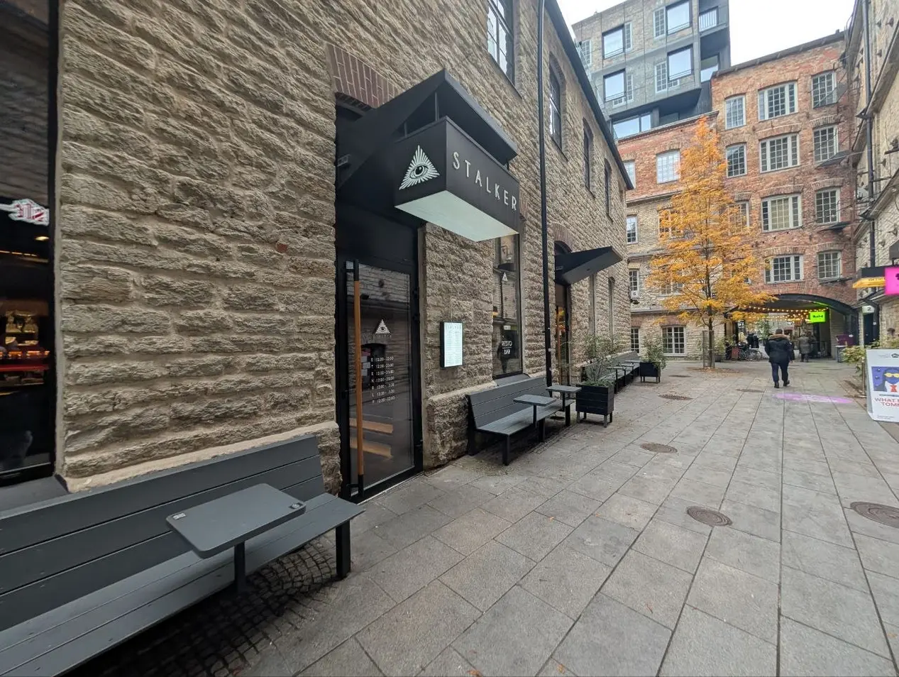 Stalker is a distinctive café-bar nestled within the cobbled alleyways of the creative Telliskivi district in Tallinn. Drawing visitors with its mysterious black awning, striking eye symbol, and the inviting glow of large windows, Stalker merges industrial heritage with bohemian flair. The establishment features intimate indoor spaces and a tranquil outdoor seating area, perfect for relaxing in every season—especially amid autumn’s golden foliage.